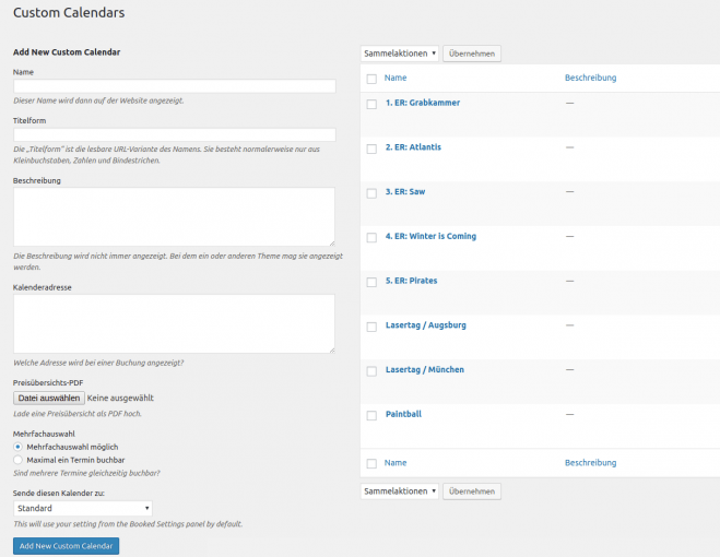 Calendars should have different properties, therefore the creation of calendars was extended by some options. Depending on the calendar, it should be possible to deactivate multiple bookings (e.g. for Escape Room games). In addition, the booking confirmation should of course be different depending on the calendar. For this purpose, an individual PDF attachment was added.