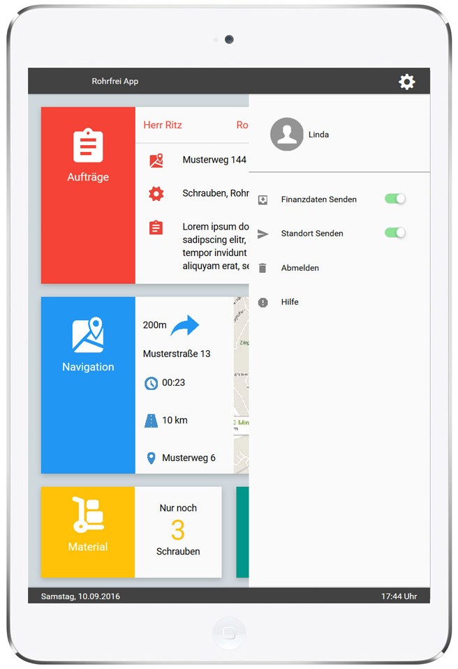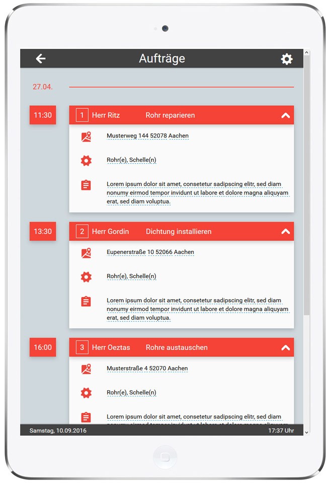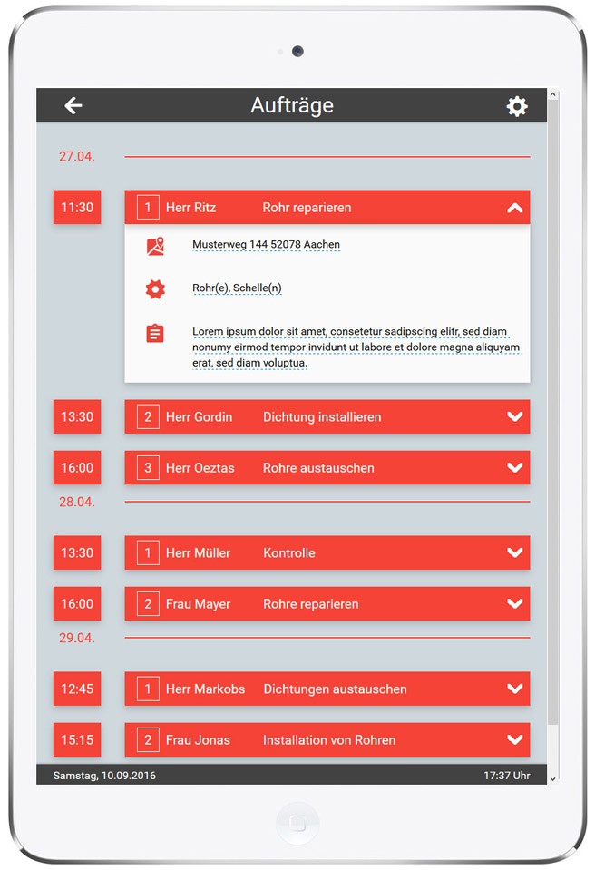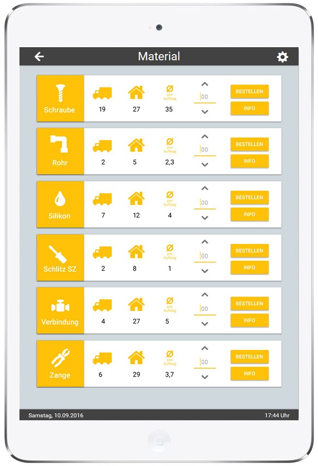 This resulted in the solution approach of a mobile application for the craft company, which should be actively used by the workers. To optimize the usability and the user experience we used the software Morea (Morae offers the possibility to test the developments in different areas. Based on the Manager, Observer and Recorder the movements and behaviors of the test persons can be recorded and evaluated) and the eye-tracker glasses "Tobii Pro Glasses 2" including the software (The saccades and the fixations of the test persons were converted as heatmap and gaze plots and matched to the surface of the prototype. This helped us to analyze the attention of the test persons and to optimize the surface accordingly).