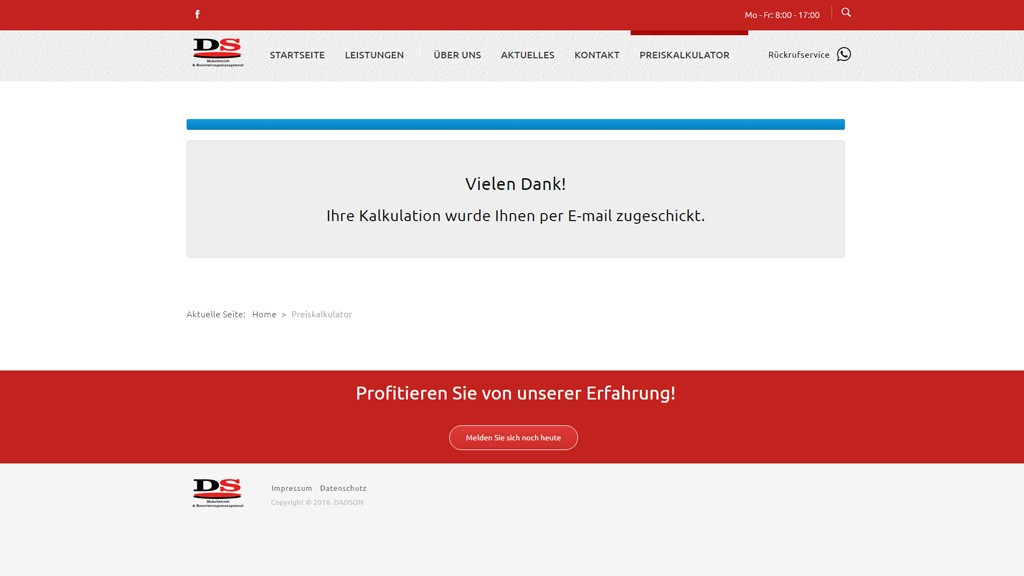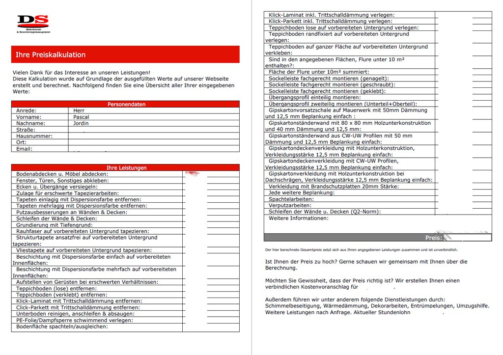 The master craftsman company DADSON would like to offer its customers and visitors a simple and convenient way to establish a cost framework themselves. Often price inquiries are not even carried out due to false expectations. This is where the service of an automated price calculator should come into play as an additional touchpoint. We were given the goal of user-friendliness and accuracy. The calculation as well as the creation of a detailed list as a PDF must be automated.