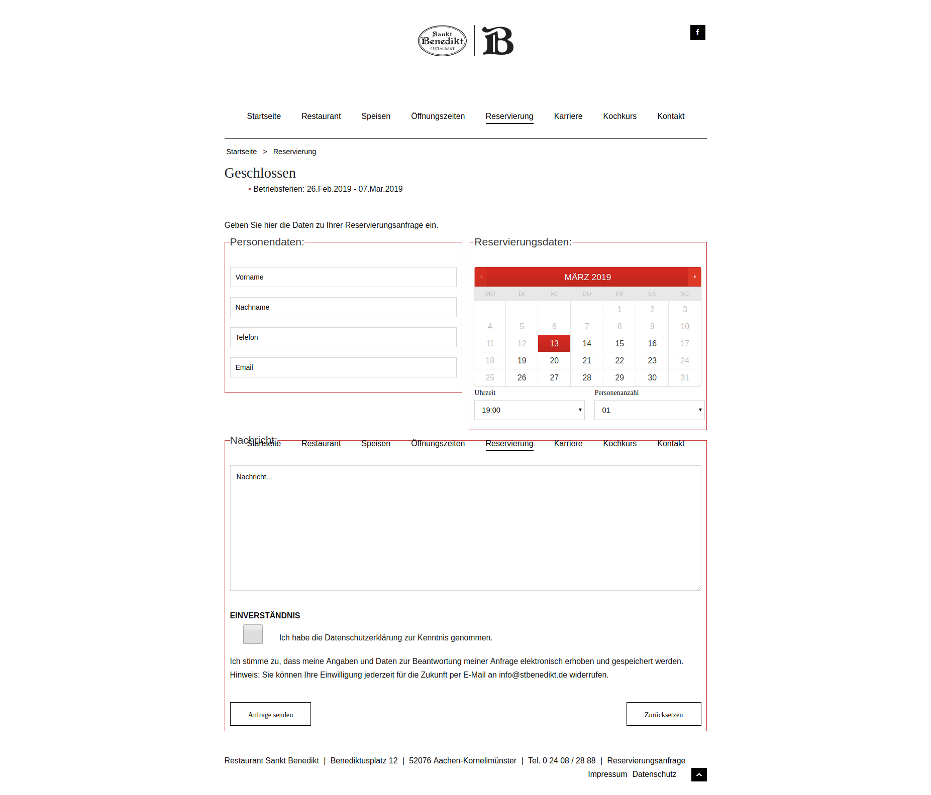 The goal was a new modern appearance of the star restaurant Sankt-Benedikt from Kornelimünster / Aachen. In addition to the requirement to implement a reduced design, an easily manageable reservation form with opening and vacation times was to be programmed. The traditional restaurant already had an established logo, but it was only available as a pixel graphic in low resolution. Therefore, the logo was to be ported into a vector graphic.